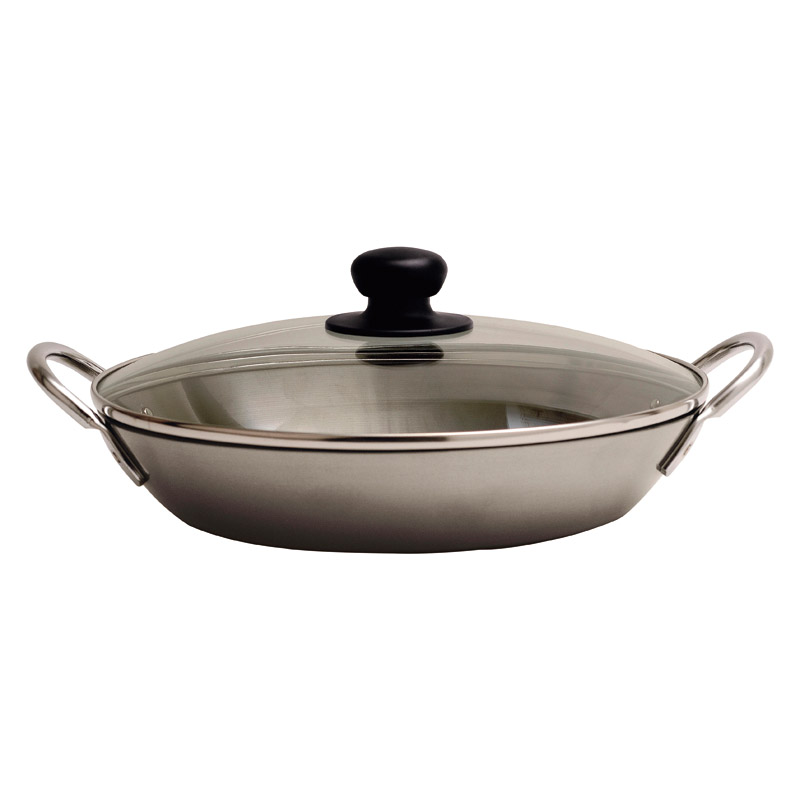 予熱したり、強火を扱うハードな調理に最適の鉄製パエリア鍋です。 一般のパエリア鍋よりも深めで調理が楽です。 そのまま卓上にも出せ、調理、蒸らしに便利なガラス蓋付き。 両手フライパンとして、焼物などにもお使い頂けます。