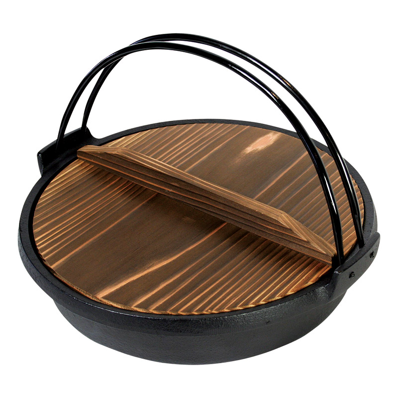 ツル付きなので持ちやすく、食卓の演出にもなる趣きのある「木蓋」がセットになっています。 蓄熱性の高い南部鉄器で出来ているため、調理時間の短縮や余熱調理が可能。