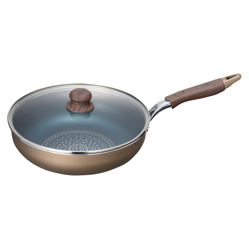 【材質】 アルミニウム合金(内面:フッ素樹脂加工、ダイヤモンドコート、外面:焼付塗装、底面:ステンレス)、フェノール樹脂、強化ガラス