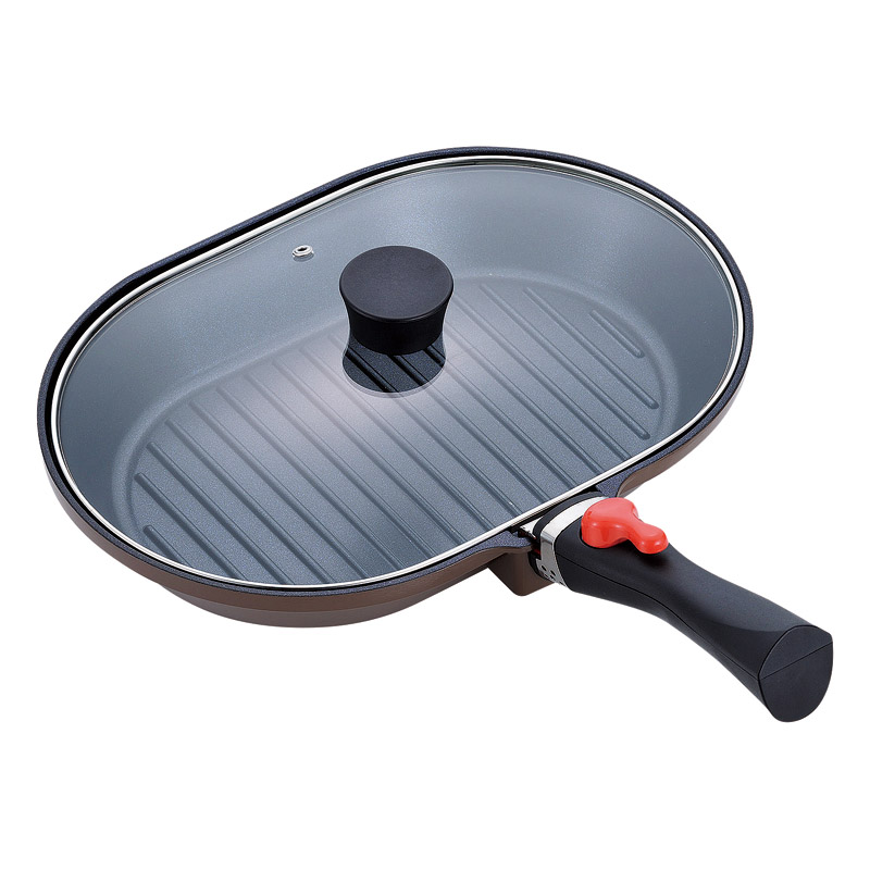余分な油を落とす凸凹付き。 外面はセラミック加工で汚れもスルッと落とせます。 収納に便利なハンドル着脱式。
