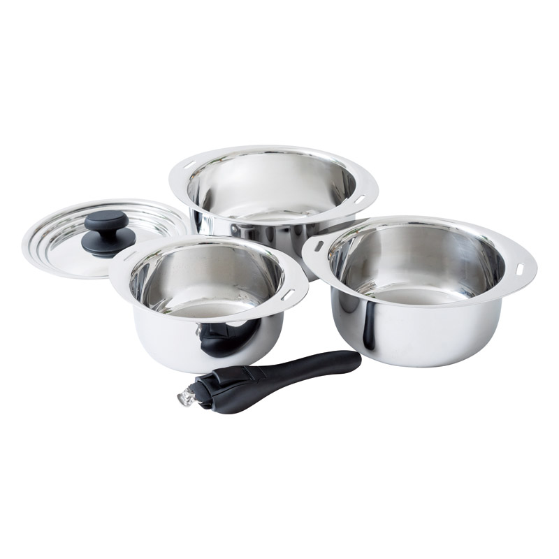 着脱式ハンドルと入れ子式本体で収納性抜群。 熱がムラなく伝わる全面3層構造でオール熱源に対応しています。