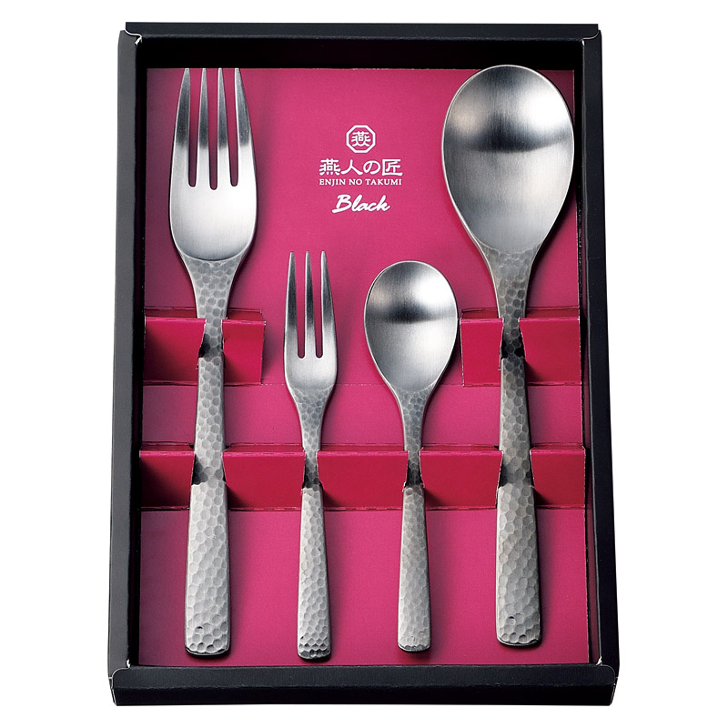匠の技が冴え渡る、陰影際立つ漆黒のカトラリー。 医療用具などにも採用される先進の黒色酸化皮膜加工を施し、優美な色彩を実現しました。 塗装やメッキとは違い、剥離して混入する恐れもありません。
