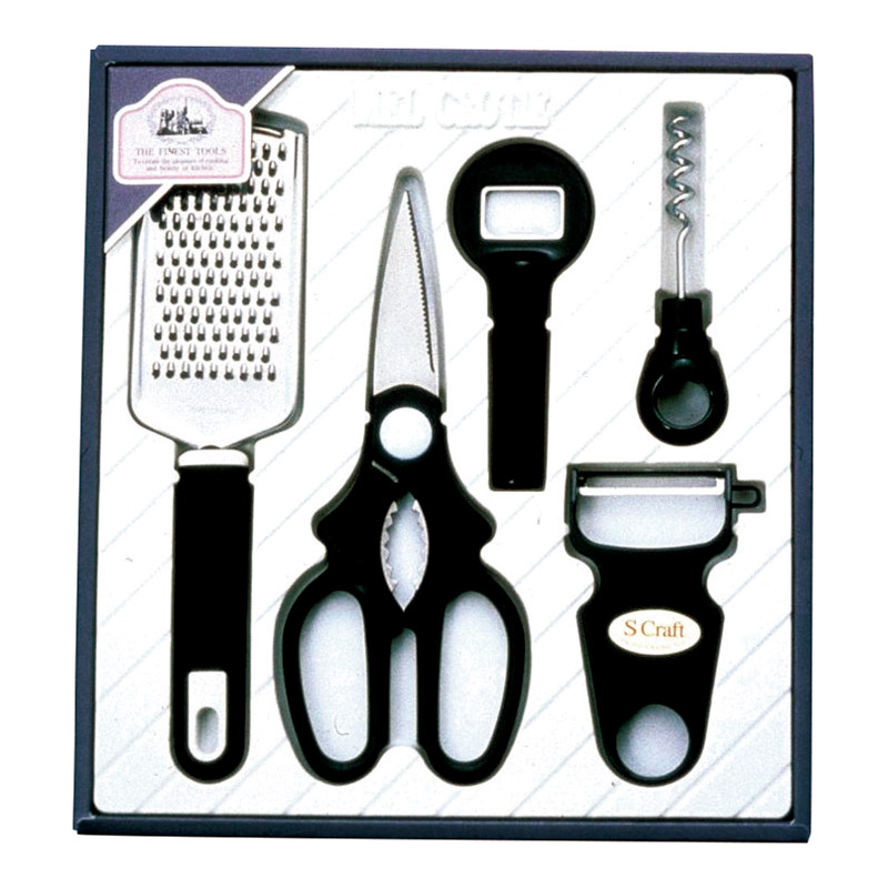 【内容】 キッチン鋏、皮引き、おろし器、コルク抜き、栓抜き×各1