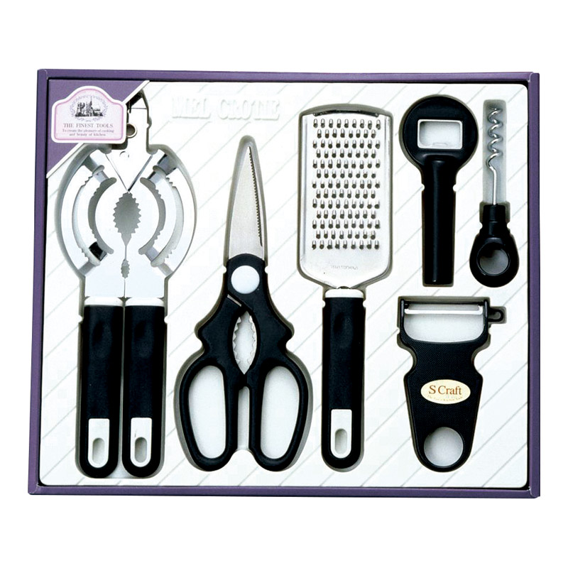 【内容】 キッチン鋏、皮引き、おろし器、コルク抜き、栓抜き、ジャーオープナー×各1