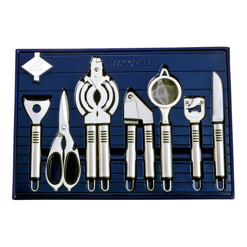 【内容】 キッチン鋏、皮引き、栓抜付缶切り、ユーティリティナイフ、茶こし、にんにく絞り、ジャーオープナー×各1