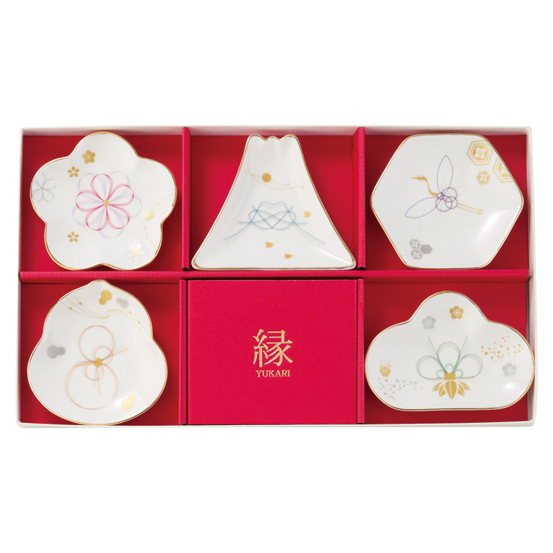 【内容】 小皿(桜)(約104×104×18mm)、小皿(富士山)(約99×116×18mm)、小皿(鶴)(約110×110×18mm)、小皿(瓢箪)(約105×98×18mm)、小皿(松竹梅)(約85×120×18mm)×各1