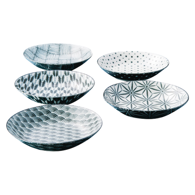 麻の葉、矢絣、豆絞、青海波、市松の5柄を撥水の技法にて下絵付しました。 シックな黒の和柄の取皿は和洋折衷でどんな食卓にも合いそうです。