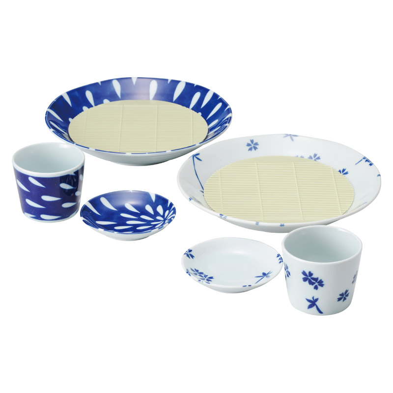 【内容】 盛皿(約直径220×40mm)、小皿(約直径103×20mm)、千代口(約直径78×65mm)、すのこ(約165×2mm)×各2