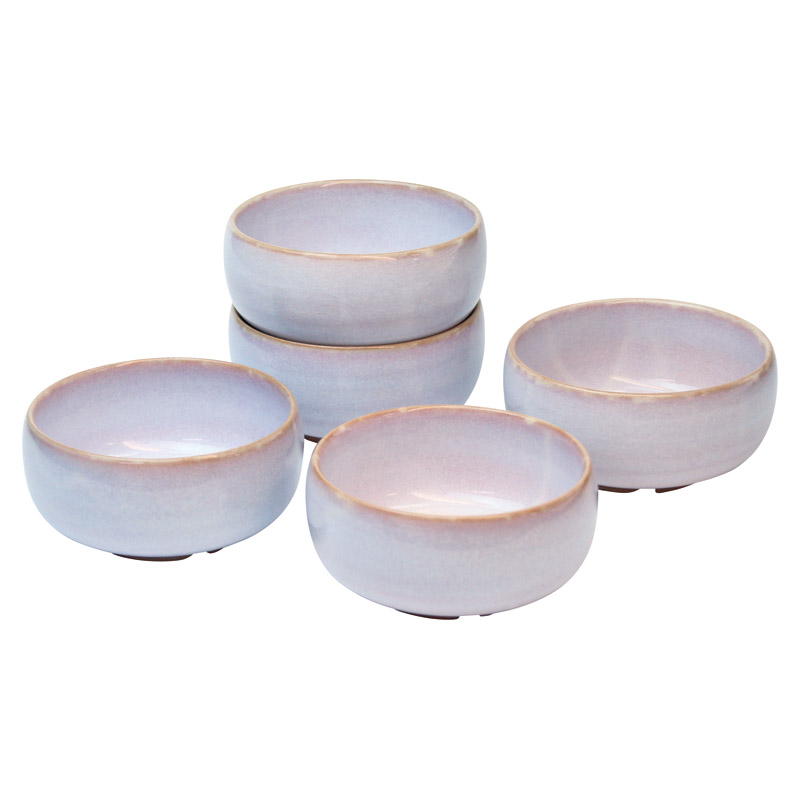 粘土と化粧土と釉薬とが重なりあった優しい色合いの萩むらさき色の小鉢揃です。 白色の化粧土で薄っすら表情が付いています。