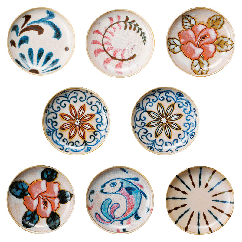 沖縄方言でめでたいを意味する「かりゆし」柄の八枚揃え。