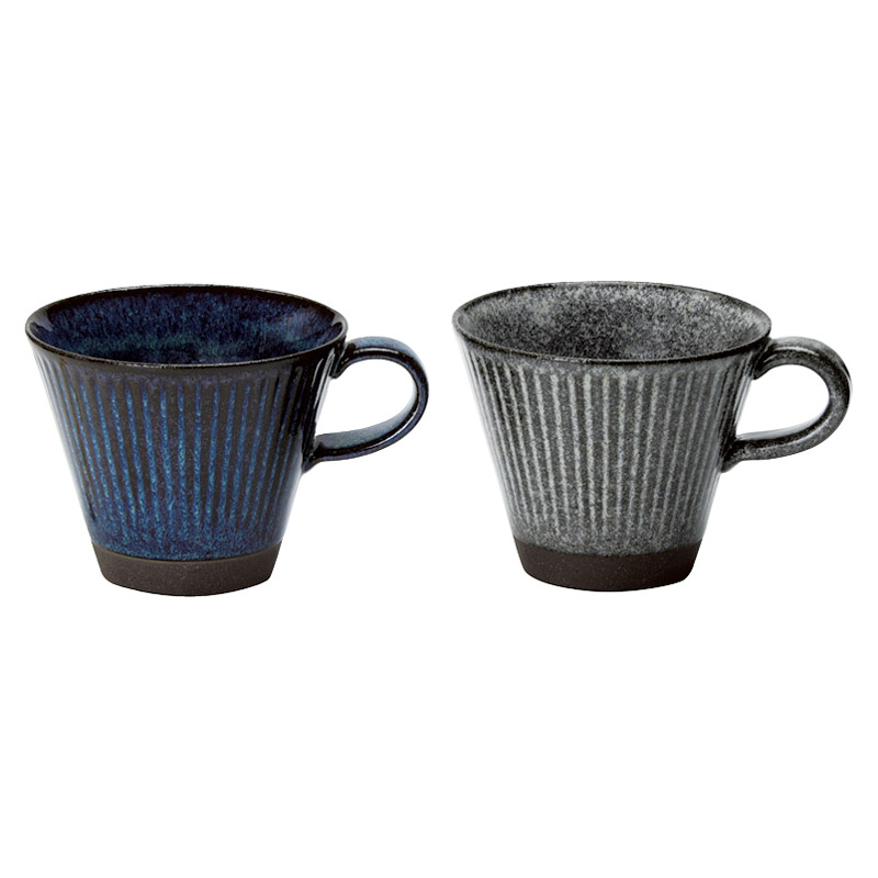 四季の陽だまりをテーマに春夏秋冬それぞれの季節感を釉薬で表現しました。 四季に合わせて贈りたいペアマグセット。 素地の黒土、計算された削ぎ模様、厳選された釉薬、作り手のこだわりが伝わるシンプルながら味わい深い美濃焼のマグ。