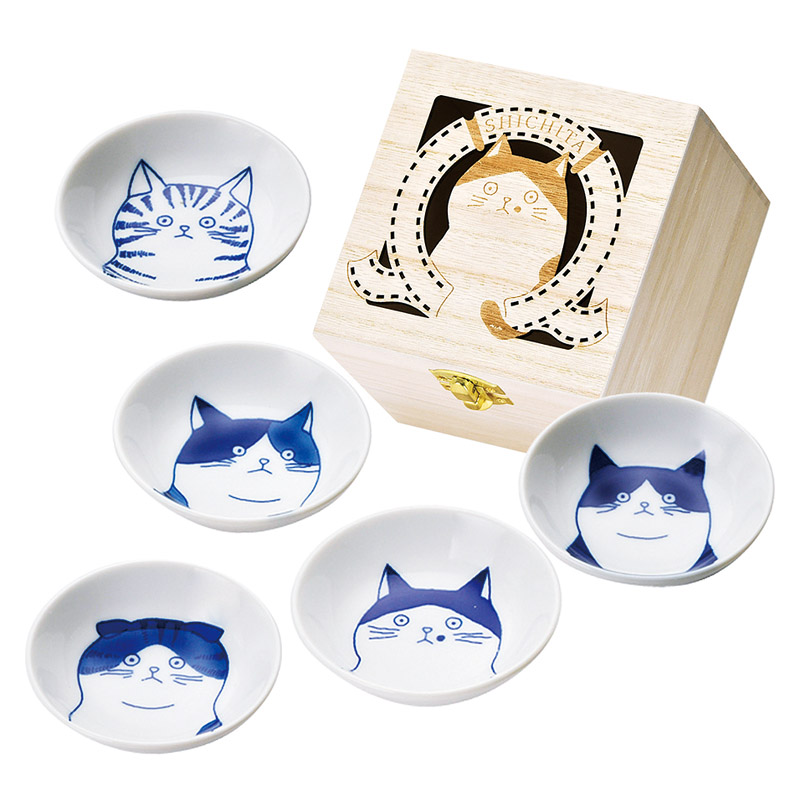 ノラ、ミケ、ドラ、スコティッシュ、ハチワレ五種の可愛らしく個性的な猫をイメージした深みのある「豆鉢」をSHICHITAの透かし彫りの木箱にセットしました。