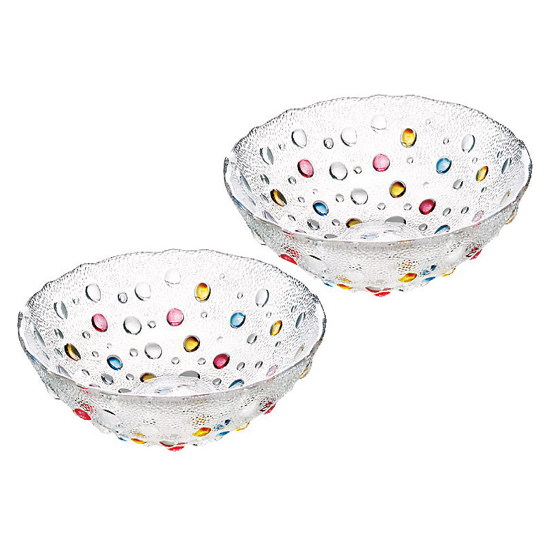 透明ガラスにあしらったバブルデザインは、まるで色とりどりの宝石を散りばめたよう。 立体感のあるキュートな雰囲気と、使いやすい厚さで人気のバブルシリーズ。 料理や素材の盛り付けに、爽やかで楽しいコーディネートが広がります。