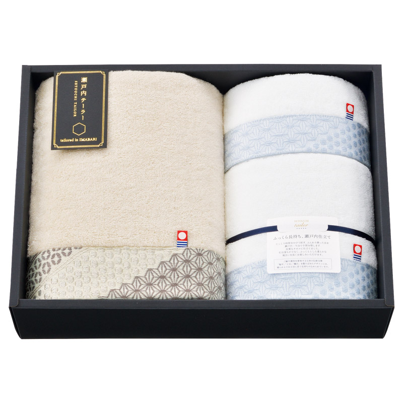 ふっくら長持ち、瀬戸内仕立て。 時間をかけて紡いだ糸をふんわりと撚り、良質なタオルに仕立てました。 ご縁と調和を意味する「亀甲」「籠目」「七宝」を散りばめたデザインのギフトです。