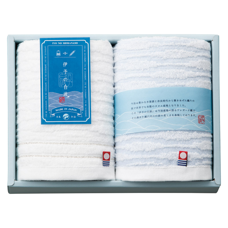 今治の誇るジャガード織で、その昔「伊予」という地名の由来となった「水の湧き出ずる」様子を表現したタオルです。 パイル部分には緩く撚った国産紡績糸を使用し、やわらかな肌ざわりです。