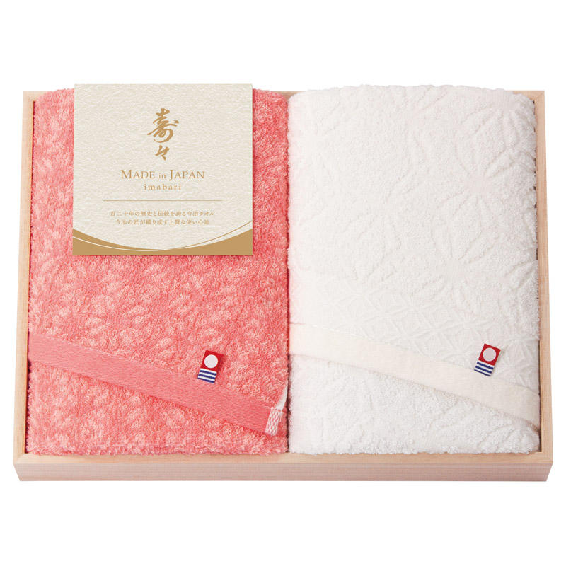 人の一生を表す紅白の色彩に成長を願う麻の葉模様を織り上げた格調高い木箱入りの今治タオル。 成長の願いを込めた紅白の今治タオルは、お祝いや感謝の気持ちを込めて大切な方への贈りものに。