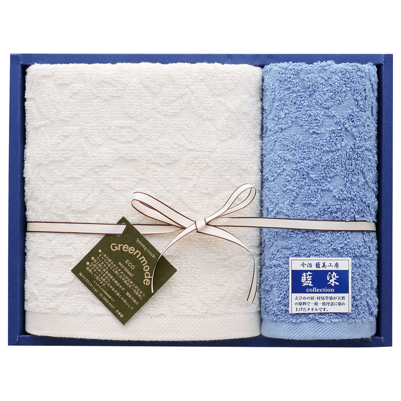 無漂白、無染色のナチュラルなエコタオルに藍染をプラス。 2色の組み合わせが上品で美しいセットです。