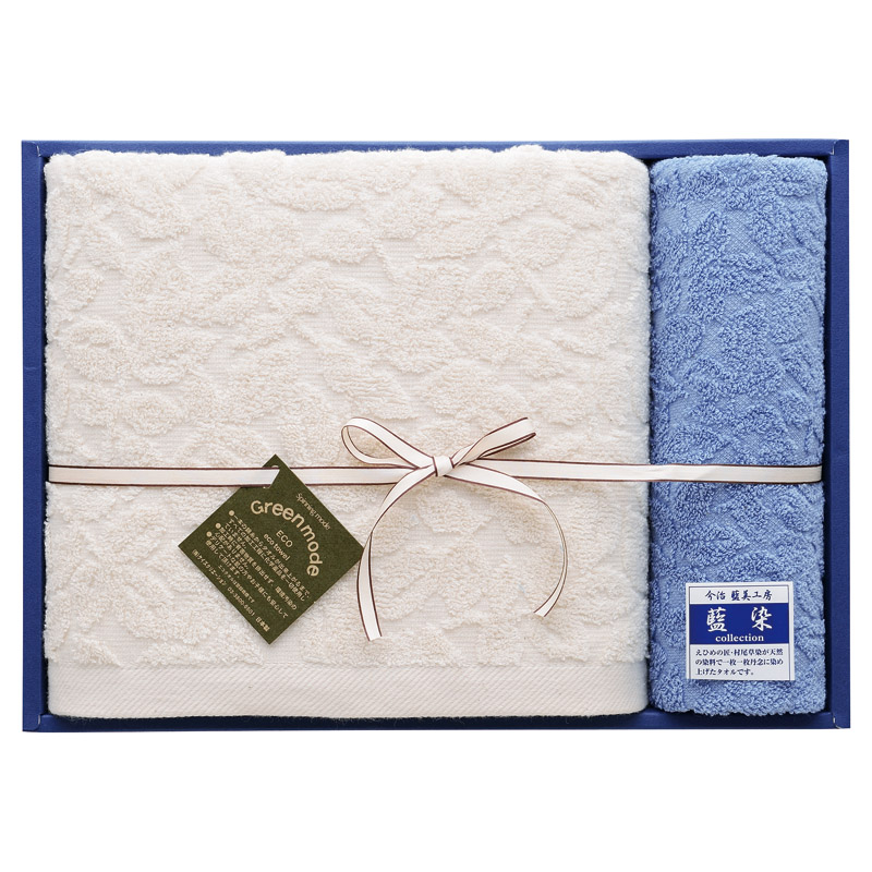 無漂白、無染色のナチュラルなエコタオルに藍染をプラス。 2色の組み合わせが上品で美しいセットです。