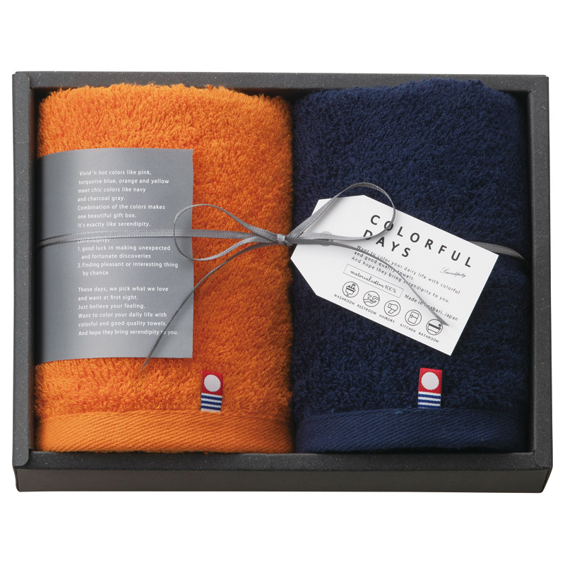 トレンドカラーのタオルとおしゃれなチャコールグレイの箱の組み合わせが洗練された印象を与える、モダンな雰囲気のタオルギフト。