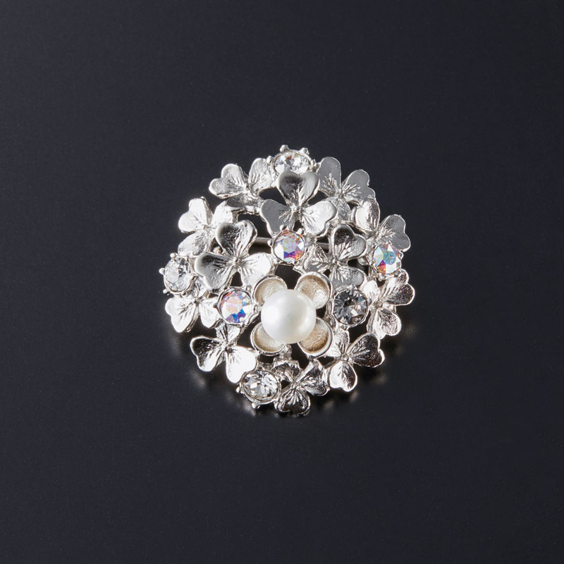 可愛いあじさいモチーフのブローチです。 プックリとした艶のある淡水真珠をあしらいました。 沢山の小花の間には大きめのクリスタルが煌き、存在感があります。