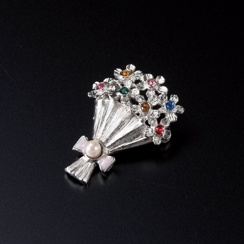 花束をモチーフにしたアコヤ本真珠ブローチです。 花びらの部分や紙のしわなど、リアルに表現されています。 色とりどりのクリスタルが華やかです。 希少価値のあるベビーパールを使用しています。