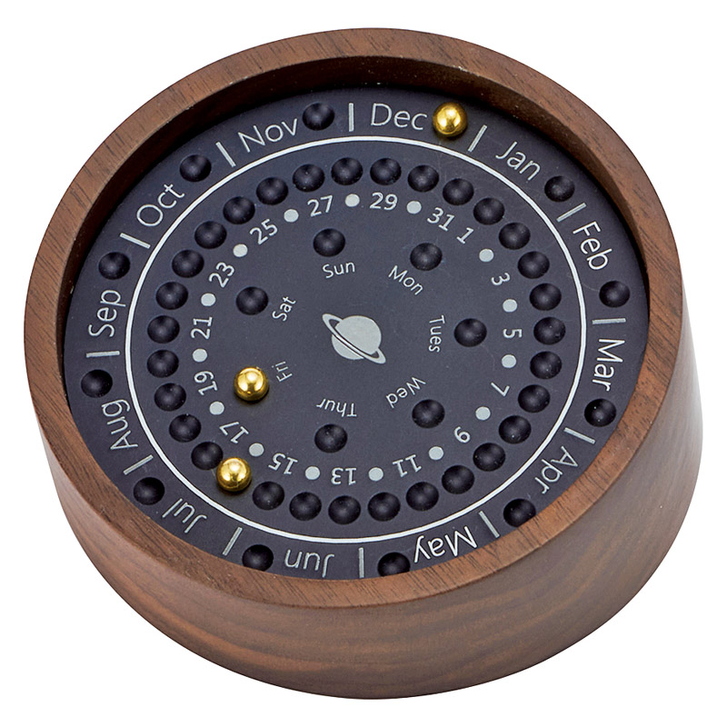 お気に入りのスペースに置いて長く楽しみたい大人のためのスタイリッシュなデザインの万年カレンダー。 宇宙を感じさせる美しいデザインながら、月、日付、さらに曜日もマークされ、機能性も納得の優秀アイテムです。