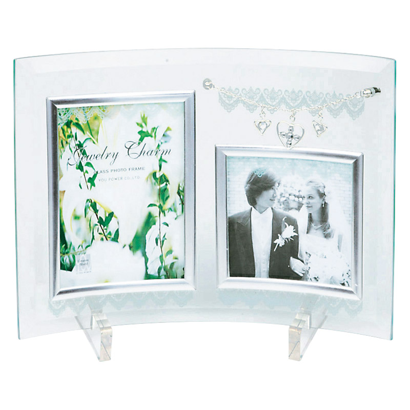 ガラスにハート型のキラキラチャームを付け、シルバー色のレース柄をプリントした華やかなフォトフレームです。