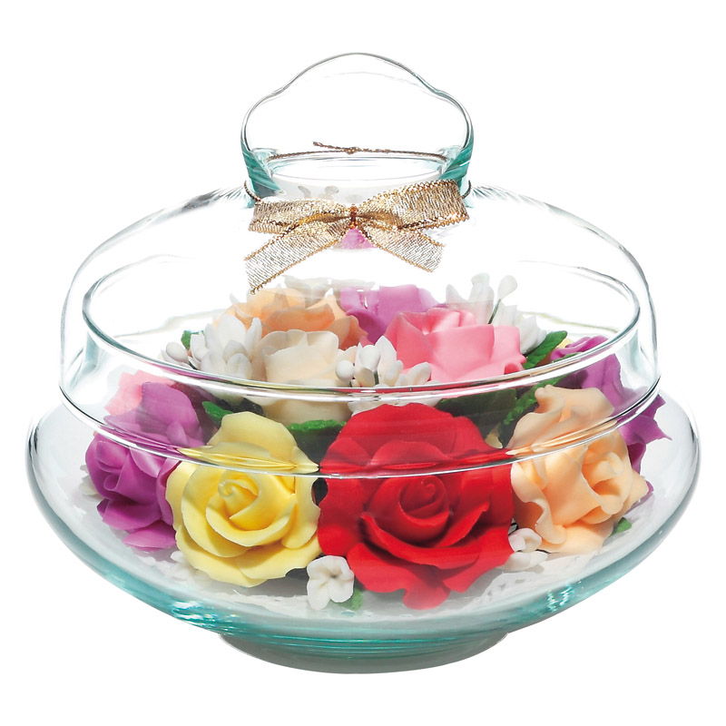 花びら一枚一枚を丹念に手作りしています。 ガラスの中の可愛らしい花々を、大切な方への贈りものに。 清楚な石鹸のイメージと共に心癒やすお部屋のアクセントになります。