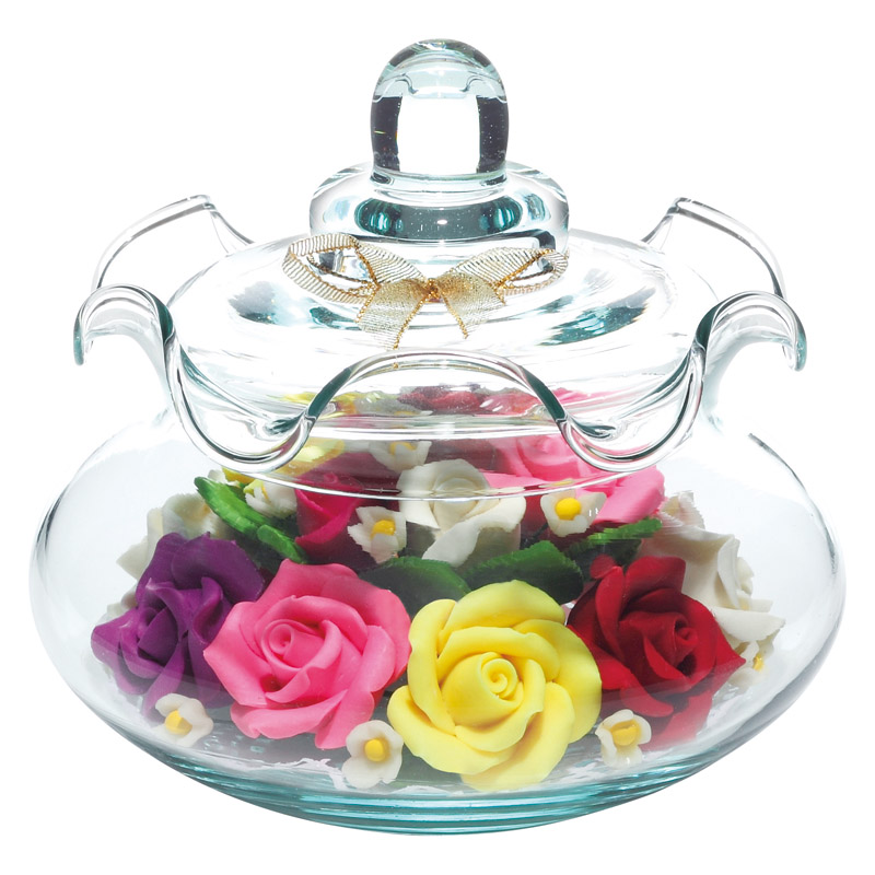 花びら一枚一枚を丹念に手作りしています。 ガラスの中の可愛らしい花々を、大切な方への贈りものに。 清楚な石鹸のイメージと共に心癒やすお部屋のアクセントになります。
