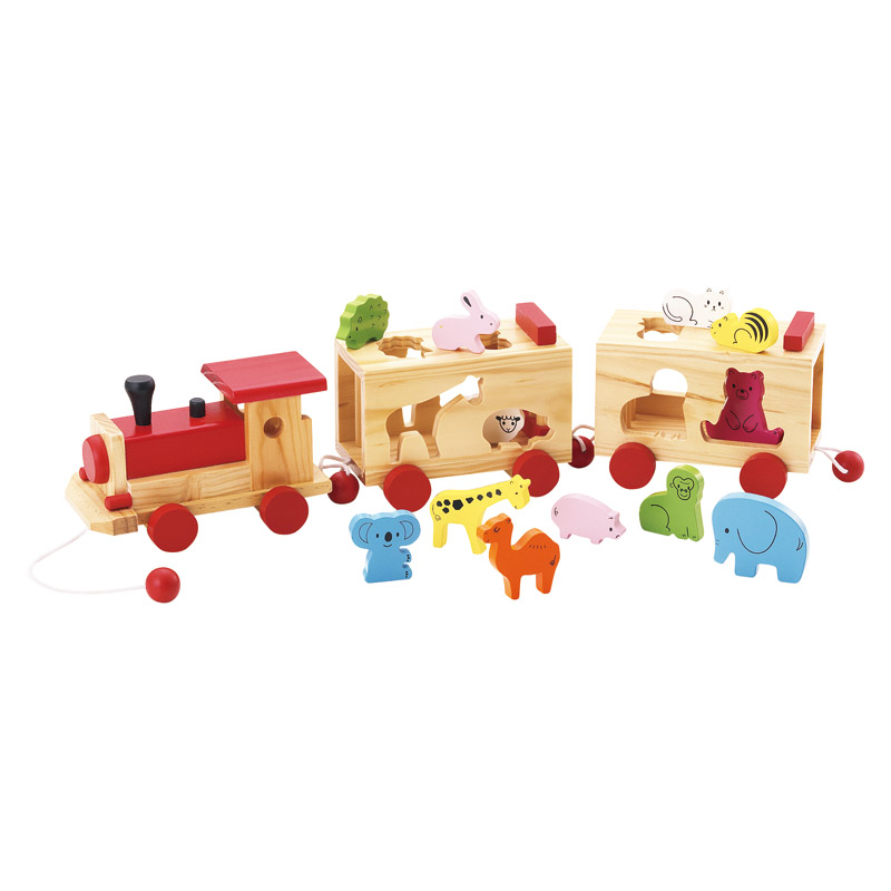 かわいらしい汽車の木製プルトーイです。 カラフルな動物のピースを使って形合わせも楽しめます。