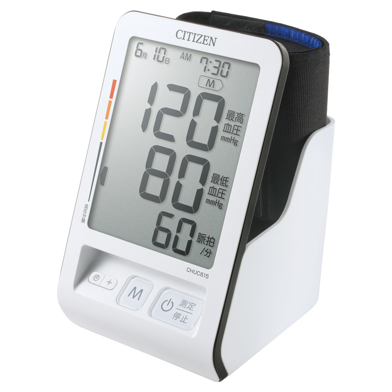 見やすさと操作性にこだわった液晶表示、大型測定ボタン。 ■90回分の測定値をメモリー■測定した血圧値を6段階で分類表示■測定中の体動、脈間隔の変動をお知らせ■カフ巻きエラーマーク■選べる3パターンの時計表示