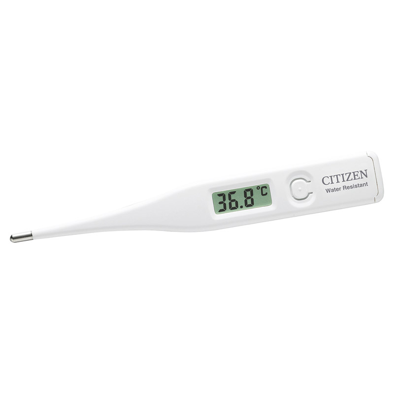 スタンダードタイプの実測式。 抗菌、防水仕様で水で洗えて清潔。 わきでも口でも検温可能。 実測式防水抗菌前回値メモリー
