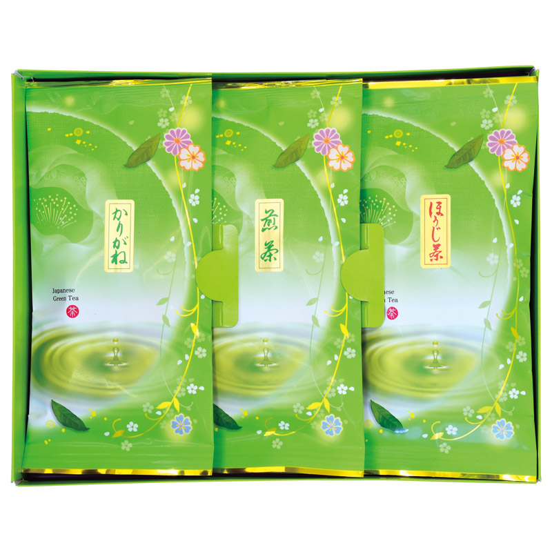 【内容】 煎茶(約70g)、雁が音(約70g)、ほうじ茶(約30g)×各1