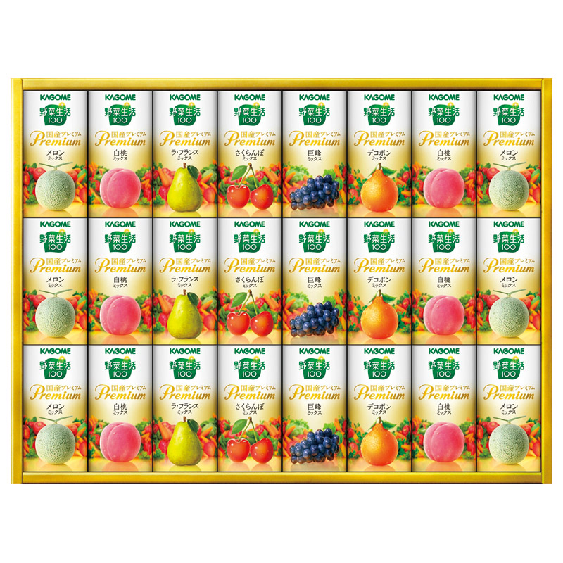【内容】 野菜生活100国産プレミアム(白桃ミックス、メロンミックス)(約125ml)×各6、野菜生活100国産プレミアム(さくらんぼミックス、ラフランスミックス、デコポンミックス、巨峰ミックス)(約125ml)×各3