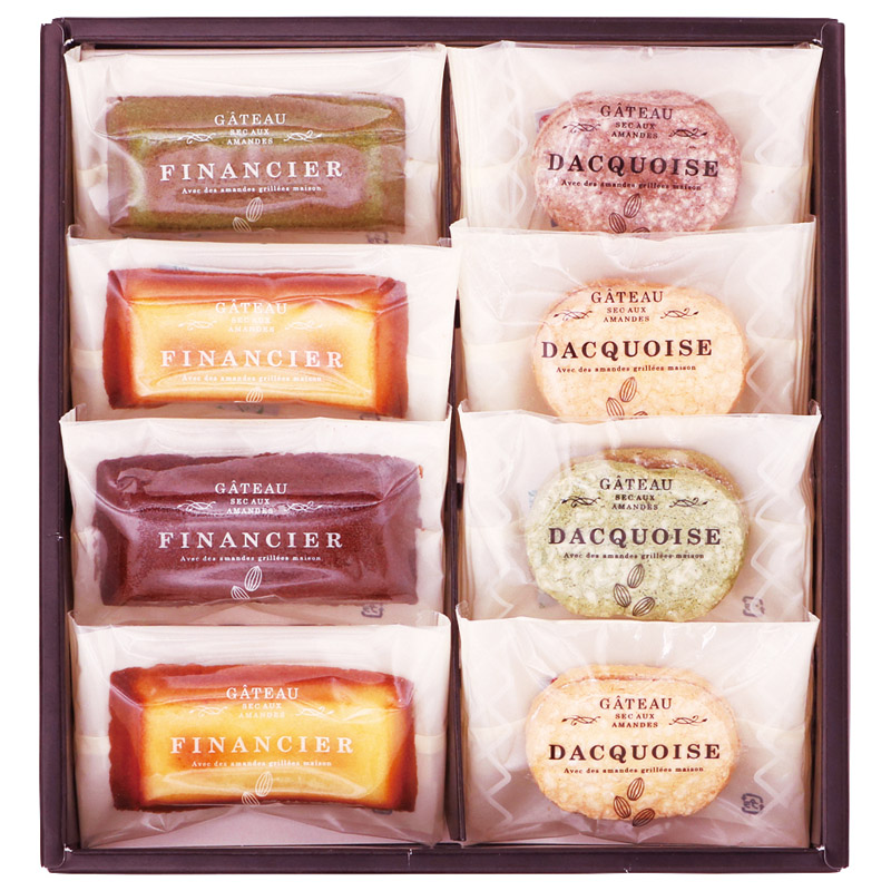 【内容】 ダックワーズ(プラリネ)、フィナンシェ(プレーン)×各2、ダックワーズ(ショコラ、抹茶)、フィナンシェ(ショコラ、抹茶)×各1