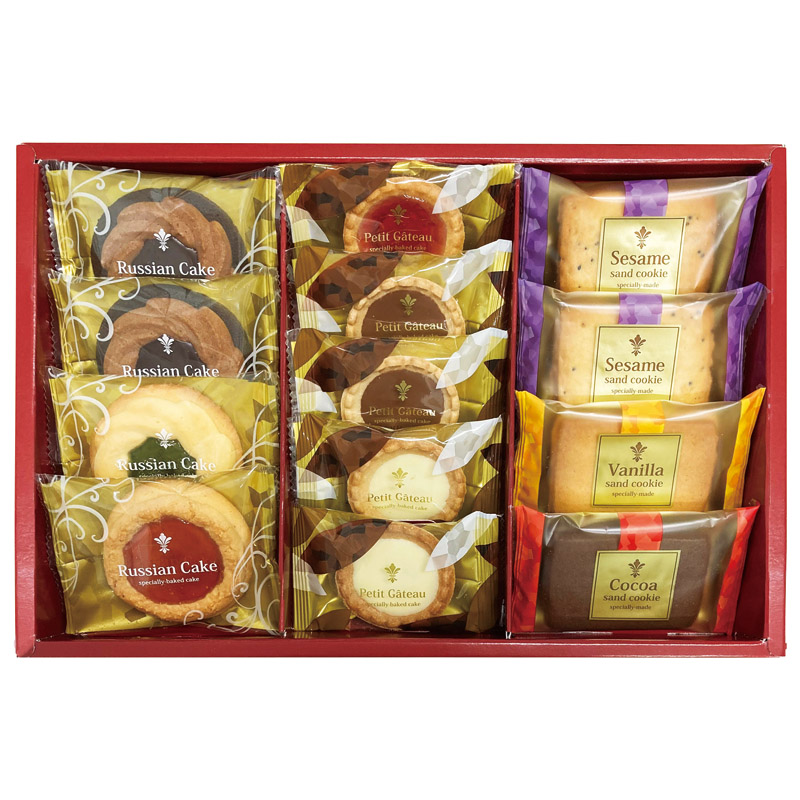 【内容】 サンドクッキー、ロシアケーキ×各4、プチガトー×5