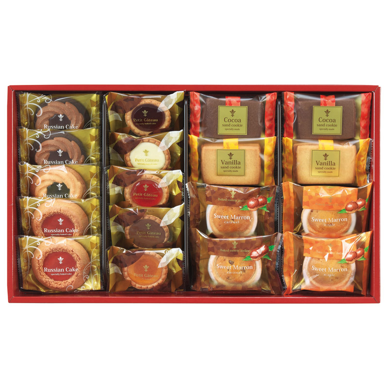 【内容】 サンドクッキー、スイートマロン×各4、プチガトー、ロシアケーキ×各5