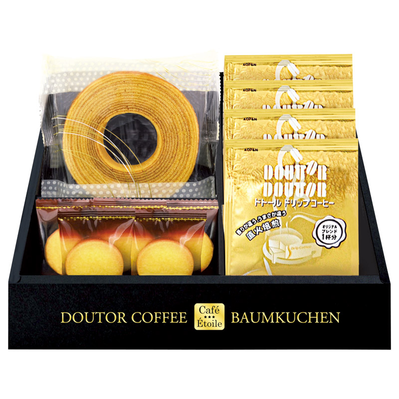 創業当時から直火焙煎にこだわるドトールのおいしさを1杯ずつパッキング。 バウムクーヘンやクッキーとセットにしました。
