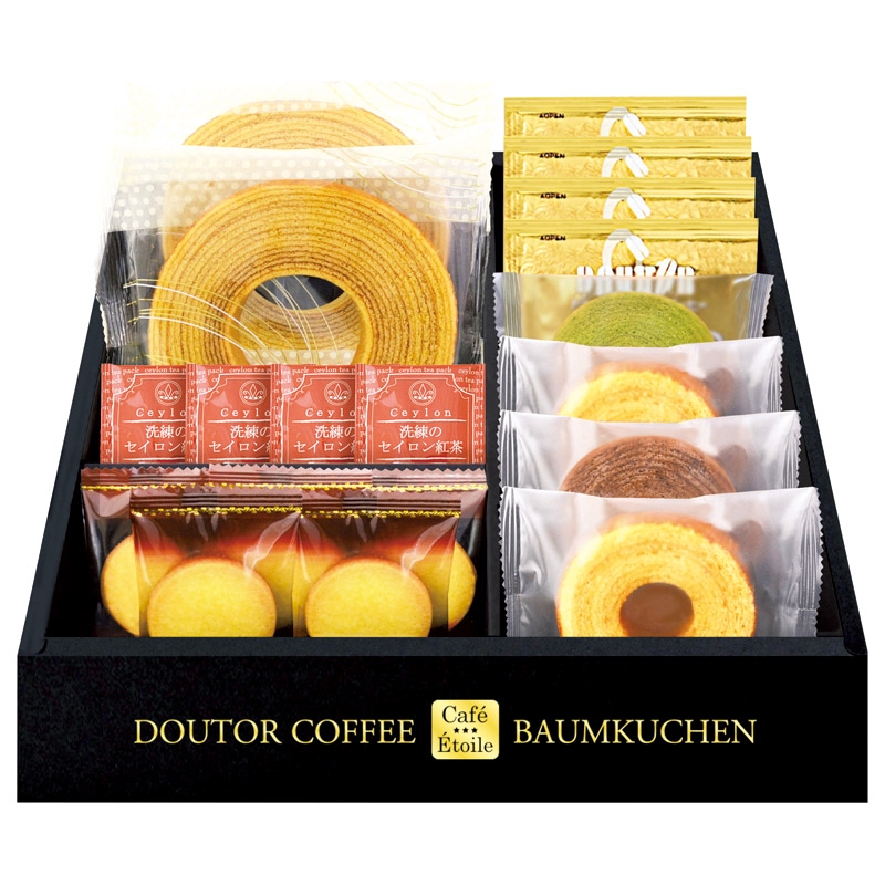 【内容】 ミルクバウムクーヘン、ミニバウムクーヘン(北海道生クリーム)×各2、ミニバウムクーヘン(ベルギーショコラ、宇治抹茶)×各1、プレーンクッキー×5、ドトールドリップコーヒー、セイロン紅茶ティーバッグ×各4