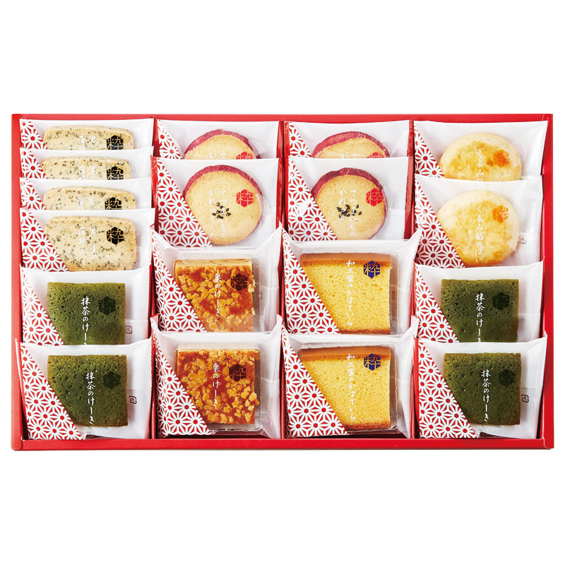 【内容】 和三蜜のかすていら、栗のけーき、くるみ餡のぱい×各2、抹茶のけーき、さつまいものがれっと、黒ごまの薄板くっきい×各4