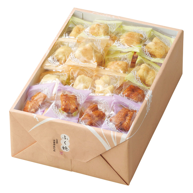 しっとりとした厚みでも、ふっくら、サクサクの「ふく穂」。 その秘密は新技術のマイクロウェーブ加熱です。 内部にも均等に火を通す焼き方なので、中までふっくらと焼きあげました。 3種類のふんわりサクサクおかき詰合せギフトです。