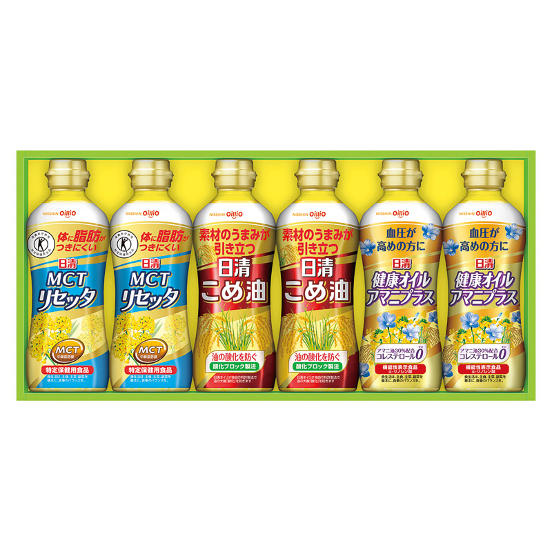 【内容】 日清MCTリセッタ(約350g)、日清こめ油(約350g)、日清健康オイルアマニプラス(約350g)×各2