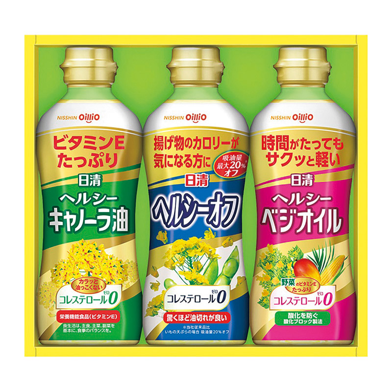【内容】 日清ヘルシーキャノーラ油(約350g)、日清ヘルシーベジオイル(約350g)、日清ヘルシーオフ(約350g)×各1