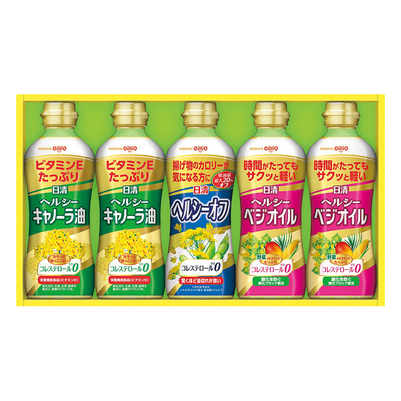 【内容】 日清ヘルシーキャノーラ油(約350g)、日清ヘルシーベジオイル(約350g)×各2、日清ヘルシーオフ(約350g)×1