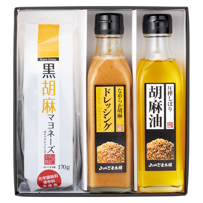 【内容】 ごま油(約180g)、えごま油入りごまドレッシング(約200ml)、黒胡麻マヨネーズ(約160g)×各1