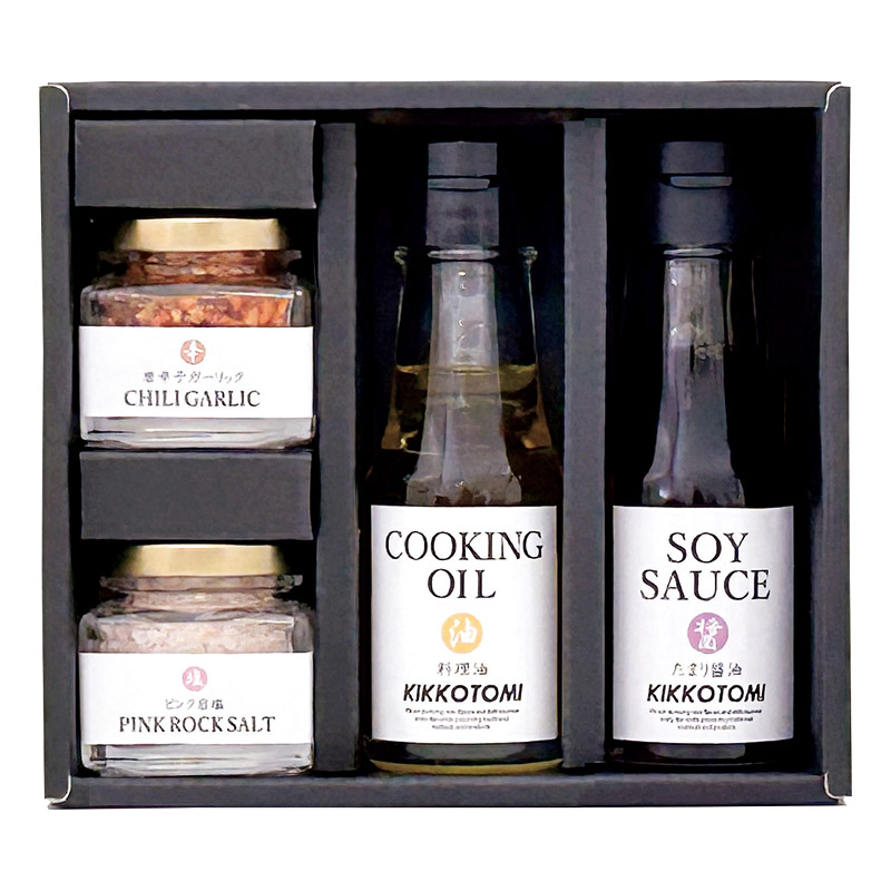 【内容】 唐辛子ガーリック(約20g)、ピンク岩塩(約45g)、クッキングオイル(約60g)、たまり醤油(約70ml)×各1