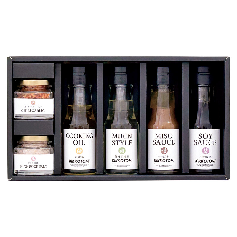【内容】 唐辛子ガーリック(約20g)、ピンク岩塩(約45g)、クッキングオイル(約60g)、みりん風発酵調味料(約70ml)、味噌たれ(約70ml)、たまり醤油(約70ml)×各1