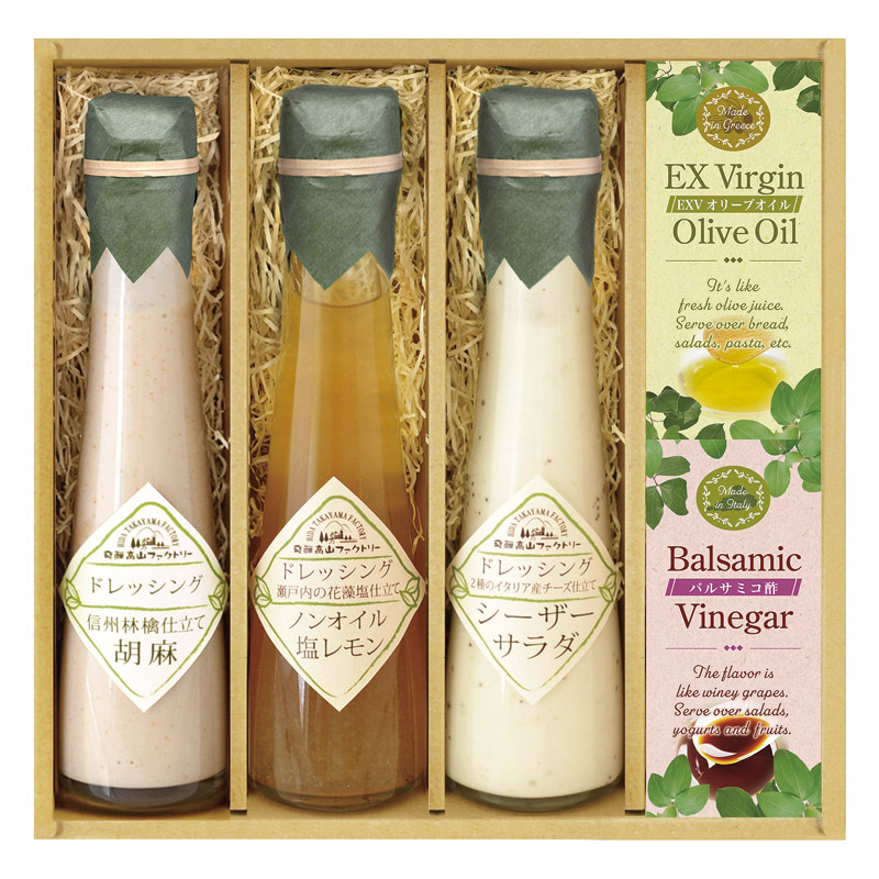 【内容】 2種のイタリア産チーズ仕立てシーザーサラダドレッシング、瀬戸内の花藻塩仕立てノンオイル塩レモンドレッシング、信州林檎仕立て胡麻ドレッシング(各約120ml)×各1、エクストラバージンオリーブオイル(約8g)、バルサミコ酢(約3. 3ml)×各3