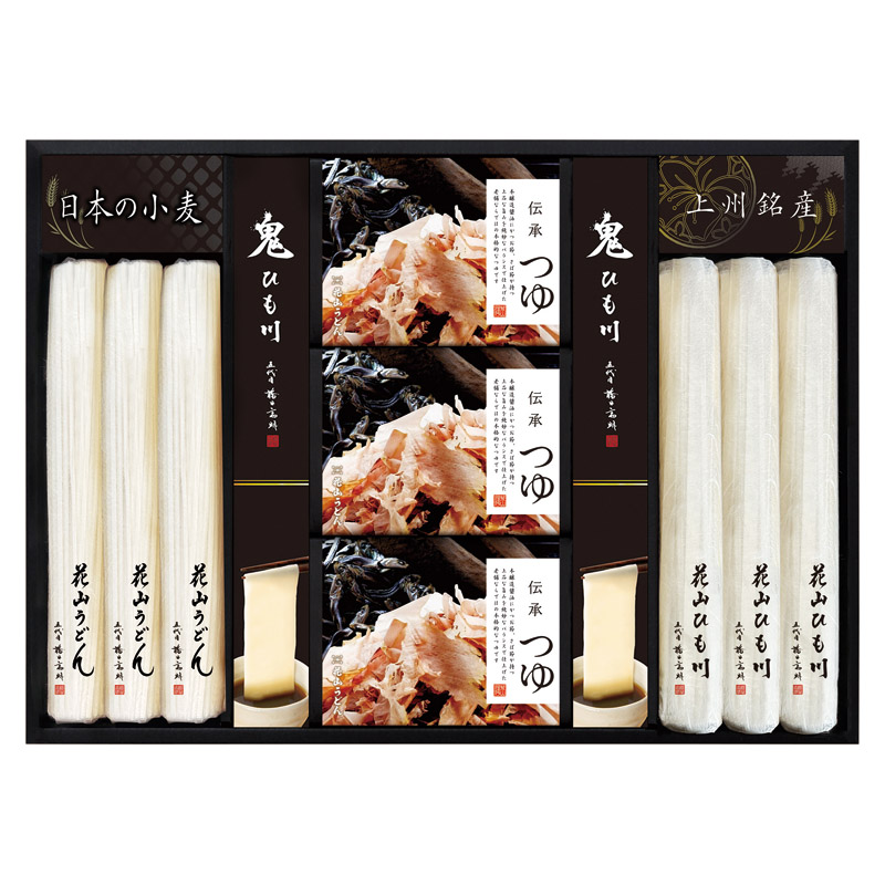 【内容】 花山うどん(約90g)、花山ひも川(約90g)×各3、鬼ひも川(約90g)×2、伝承つゆ(約70g)×9
