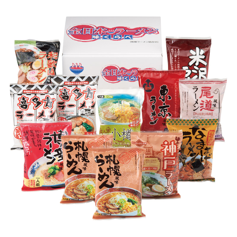 【内容】 北海道札幌ラーメン味噌味(約117g)、喜多方ラーメン醤油味(約116g)×各2、博多ラーメン豚骨味(約112g)、北海道小樽ラーメンしお味(約112g)、秋田なまはげラーメン比内地鶏醤油味(約112g)、米沢ラーメン醤油味(約110g)、東京ラーメン醤油味(約113g)、和歌山ラーメン豚骨醤油味(約117g)、神戸ラーメン醤油味(約117g)、尾道ラーメン醤油味(約116g)×各1